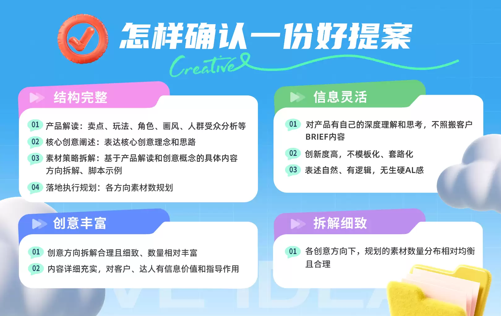 服务商提交的提案质量,是后续素材高质量交付的关键前置保障,其评估需聚焦“结构完整、信息详实、创意丰富、拆解细致”四大核心标准。