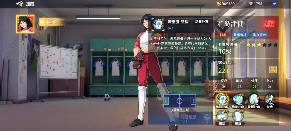 如果大家想要用他的绝技,那么带来的扑救效果就可以用若堂流·空翻这个技能来实现。这个技能使用的时候一般在对手射门时,若岛津健进行一次威力为155.6%扑救属性的扑救,如果这次射门是来自禁区内的话,则本次扑救的技能威力提升9.5%的数值。另外一个若堂流·蹬跳技能其实同样是属于若岛津健扑救的动作,不过这个动作使用的情况是针对对手抢点时才用得上,此时的若岛津健进行一次威力为115.6%反应属性的扑救,要是此时若岛津健的体力低于50%,则本次扑救的反应属性增加25.3%的数值效果,额外增加的效果确实是很不错的。