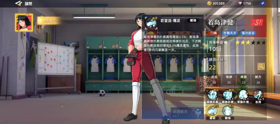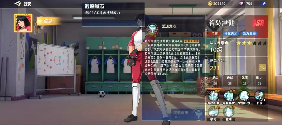 如果是希望他的扑救属性能够获得足够的增益,其实还是主要靠若堂流·爆发这个技能产生的被动效果,其中会给若岛津健的扑救属性增加3.5%的数值,然后在若岛津健释放扑救技能成功将球扑出后,下次再放扑救技能的时候还会增加8.3%爆发属性,这个效果好用是好用的,就是5秒内只能触发一次,所以要把握好好时间。另外的武道鼓舞这个技能会为若岛津健带来反应属性增加3.5%的被动效果,如果是若岛津健使用扑救技能成功将球扑出后,球更容易飞向己方的其他队友,且己方禁区内所有队友争顶属性也会得到增加6.7%的增益哦。