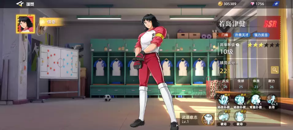 若岛津健作为门将定位的球员,自身的扑救数值相当高。原著中他也被大家认为可以作为门将天才来使用,在实战当中场上强力的反击能力也可以运用起来。目前在游戏当中若岛津健的球员评分是221分,其中比较突出的有反应26、传球25、体魄23、耐力26这几项属性数值,可以说是基础的门将能力全部达标。在这里大家观察他的六维图的话,就会发现他的能力数值基本都超过了20分,所以这名球员当门将使用的话强度自然不会差。
