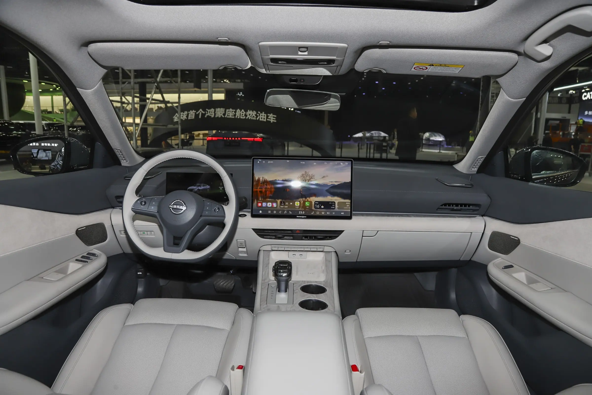 内饰革新堪称本次升级的核心亮点。全新设计的三辐式方向盘集成多功能控制面板,10.25英寸液晶仪表与15.6英寸华为山海画质智慧屏构成双屏交互系统。座舱采用贯穿式空调出风口与翻毛皮装饰材质,搭配15/17扬声器HUAWEI SOUND音响系统,营造出媲美豪华品牌的沉浸式体验。特别值得关注的是,鸿蒙座舱HarmonySpace 5的搭载,使车辆具备人脸识别、手势控制、设备流转等智能功能,无麦K歌等娱乐配置更贴合本土用户需求。