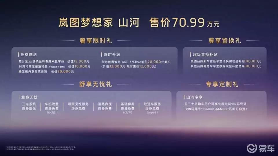 在广州车展的舞台上,备受瞩目的“新时代旗舰四座MPV”——岚图梦想家山河正式登场,以70.99万元的售价开启高端出行新篇章。此次上市,岚图还同步推出了山河专属四重礼,涵盖皓月紫云/揽晓金辉尊属双色车身、20英寸高定星漩轮毂(带岚图悬浮徽标)、殿堂级丹拿品质音响等,更有华为乾崑智驾ADS+4高阶功能包现金抵扣、超级置换补贴、专属定制VIN码权益,以及三电系统终身质保、车机流量终身免费、道路救援终身免费等丰厚权益,为消费者带来全方位的豪华体验。