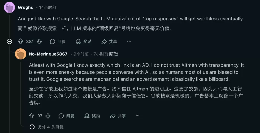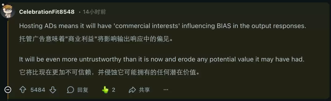 首先是用户的心理排斥。有人直言,如果ChatGPT变成一个充满广告和商品推荐的平台,以后打开它就像是被推销商品,这会让人对其产生反感。