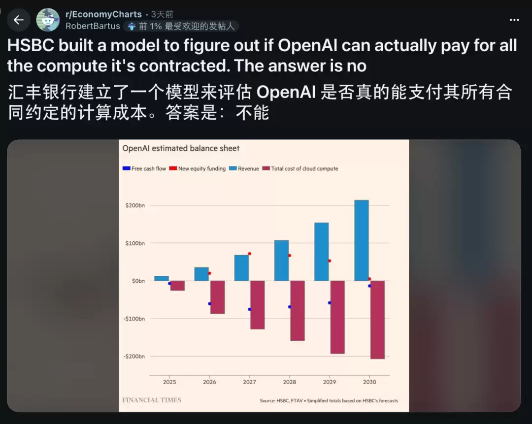 就在最近几天,汇丰银行给OpenAI算了一笔账,指出该公司每年需烧掉620亿美元来维持算力,但收入存在巨大缺口,到2030年前需要额外筹集至少2070亿美元。