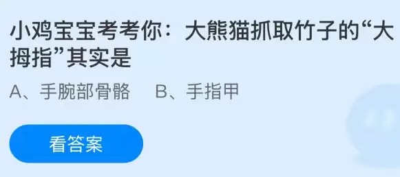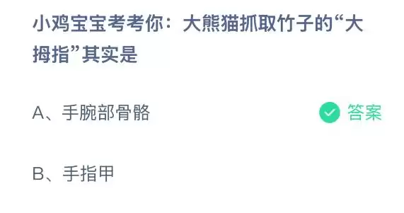 小鸡宝宝考考你:大熊猫抓竹子时用的"大拇指"到底是什么?支付宝小鸡课堂开课啦!每天花一分钟答题赚饲料,喂喂小鸡就能奉献爱心哦!简单又有意义!2025年11月30日蚂蚁庄园的课堂题目正确答案是【手腕部骨骼】——大熊猫的"第六指"其实是其掌前端增大的"桡侧籽骨",属于手腕部骨骼,而非手指甲。