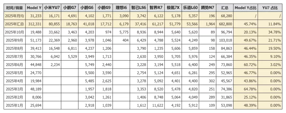 在细分市场层面,15-30万元纯电SUV领域呈现明显分层:15万元级主打性价比标签,如比亚迪海狮06;20万元级聚集了极氪7X、乐道L60等“守门员”产品;25万元级则由Model Y长期占据主导地位。小米YU7精准切入这一区间,通过“更大空间、更高配置、相近价格”的产品策略直指标杆车型。数据显示,YU7上市后迅速抢占该细分领域近三分之一份额,且占比持续扩大,对Model Y形成实质性冲击。