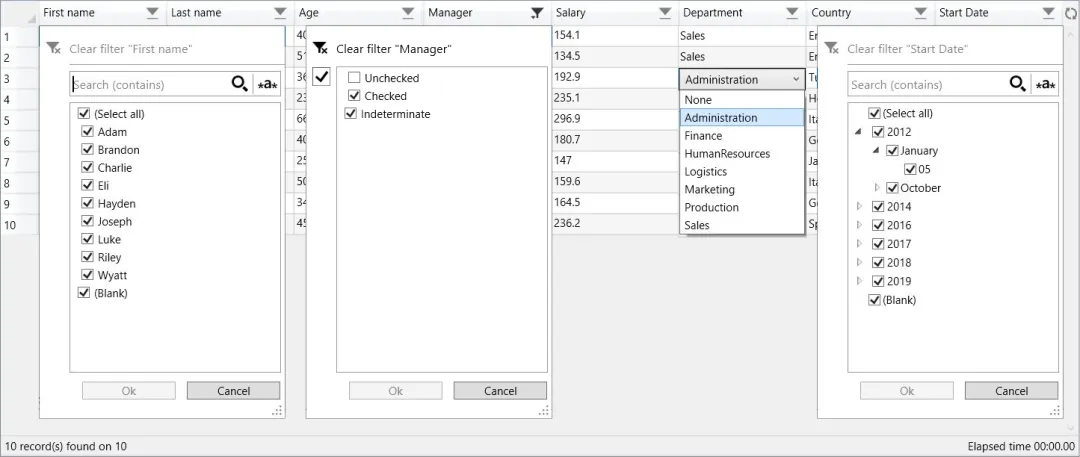 单列筛选:支持对数据表格中每一列进行独立的筛选操作。 多列联合筛选:允许同时对多个列进行条件筛选,用户可以通过逻辑运算符(如AND、OR)组合多个筛选条件。 动态过滤:能够根据用户输入或其他事件实时更新筛选结果。 多语言支持:完整支持中文(繁体和简体)、荷兰语、英语、法语、德语等多种语言的界面翻译和日期格式适配。