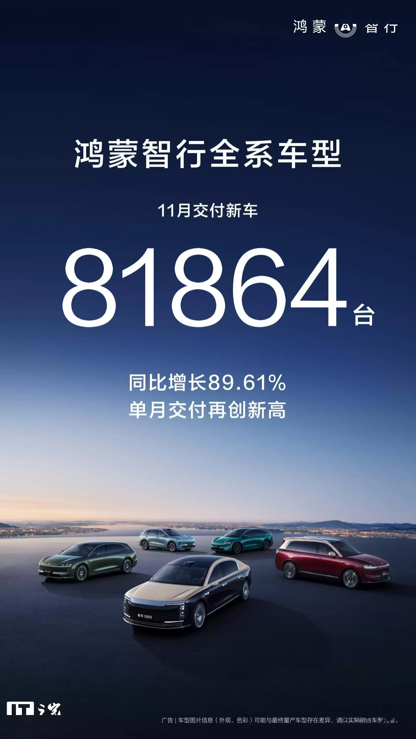 鸿蒙智行近日公布了最新交付数据,再次刷新了市场纪录。根据最新披露,旗下全系车型在11月实现了81,864台的交付量,同比增长幅度高达89.61%。这一亮眼成绩不仅远超去年同期水平,更创下了单月交付量的历史新高,展现出强劲的市场增长势头。