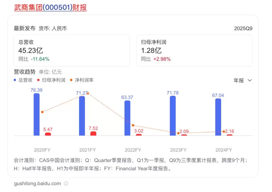 2020至2024年间,武商集团营收分别为76.39亿元、71.27亿元、63.37亿元、71.78亿元及67.04亿元;归属于母公司股东的净利润依次为5.47亿元、7.52亿元、3.02亿元、2.09亿元和2.16亿元。今年前三季度,公司实现营业收入45.23亿元,净利润为1.28亿元,净利润率达2.83%。截至今年9月底,集团总资产为310.5亿元,净资产109.6亿元,资产负债率为65%。截至最新收盘,武商集团股价下跌3.15%,收于9.85元/股,总市值为75.75亿元。