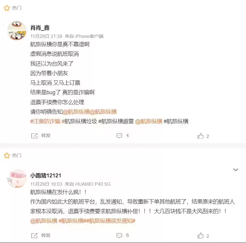 12月1日消息,据广州广播电视台报道,多位网友近日反映,在11月29日下午3点左右,收到了来自航旅纵横平台的航班取消提醒。部分乘客在重新购票后才发现,实际航班并未变动,而是航旅纵横系统出现故障,错误推送了消息,导致不少旅客额外承担了机票差价和退票手续费。