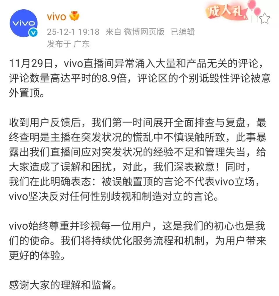 12月1日消息,最新通报显示,vivo直播平台于11月29日出现异常状况,直播间突然涌入大量与产品无关的评论,数量高达日常的8.9倍,部分评论区甚至出现不当言论被意外置顶。