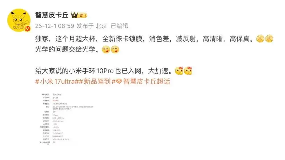 在消费电子领域,小米手机业务同样引人关注。据科技博主@智慧皮卡丘 透露,小米即将在本月发布一款影像旗舰机型,或将被命名为小米17 Ultra。这款新机将搭载全新的镀铋膜技术,重点优化色彩还原与减反射效果,进一步强化高清锐度与高保真成像能力。结合爆料话题标签分析,这款新机有望延续小米在移动影像领域的技术深耕路线。