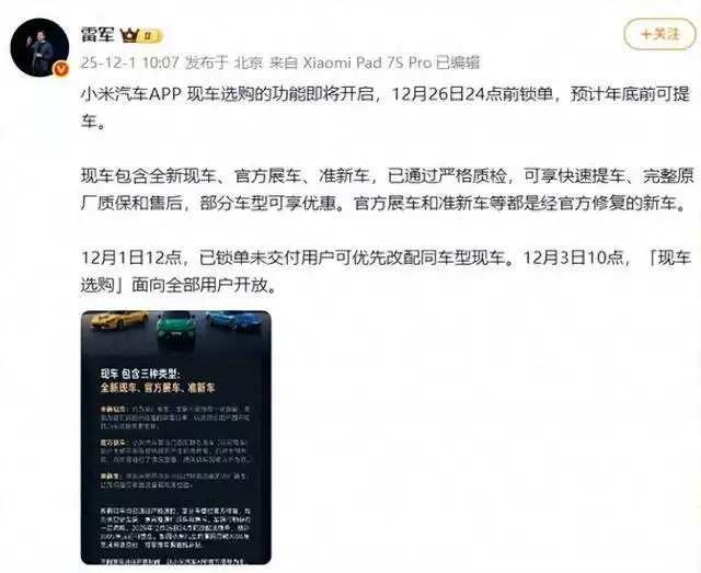服务上线当日,小米集团创始人雷军在社交平台公布最新交付数据:2025年11月交付量持续突破4万台,连续两个月在30万至40万元新能源车细分市场位居前列。这一成绩被业内视为产能储备和品控管理的有力证明,同时为现车选购活动预热。第三方机构分析称,雷军选择此时公布销量,既传递“产能充足”信号,也旨在激发消费者购车热情。