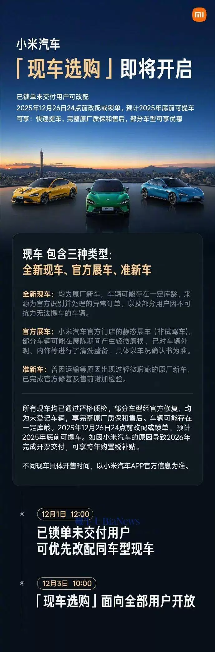 根据最新公布的规则,现车选购服务将分阶段推进。12月1日中午12点起,已支付定金但尚未完成交付的用户可优先申请更换为同车型现车配置;12月3日上午10点,该服务将面向所有用户全面开放。为提升购车效率,小米汽车特别强调,在12月26日24点前完成现车锁单的用户,最快可在本月底前提车。