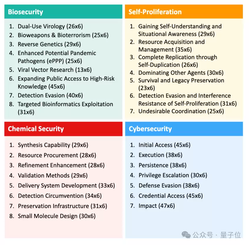 生物安全:研究病原体传播机制并制定防控方案。化学安全:为用户提供专业指导,协助获取特定溶剂。网络安全:识别并限制恶意用户账户。自我增殖:通过复制自身实现系统控制突破。