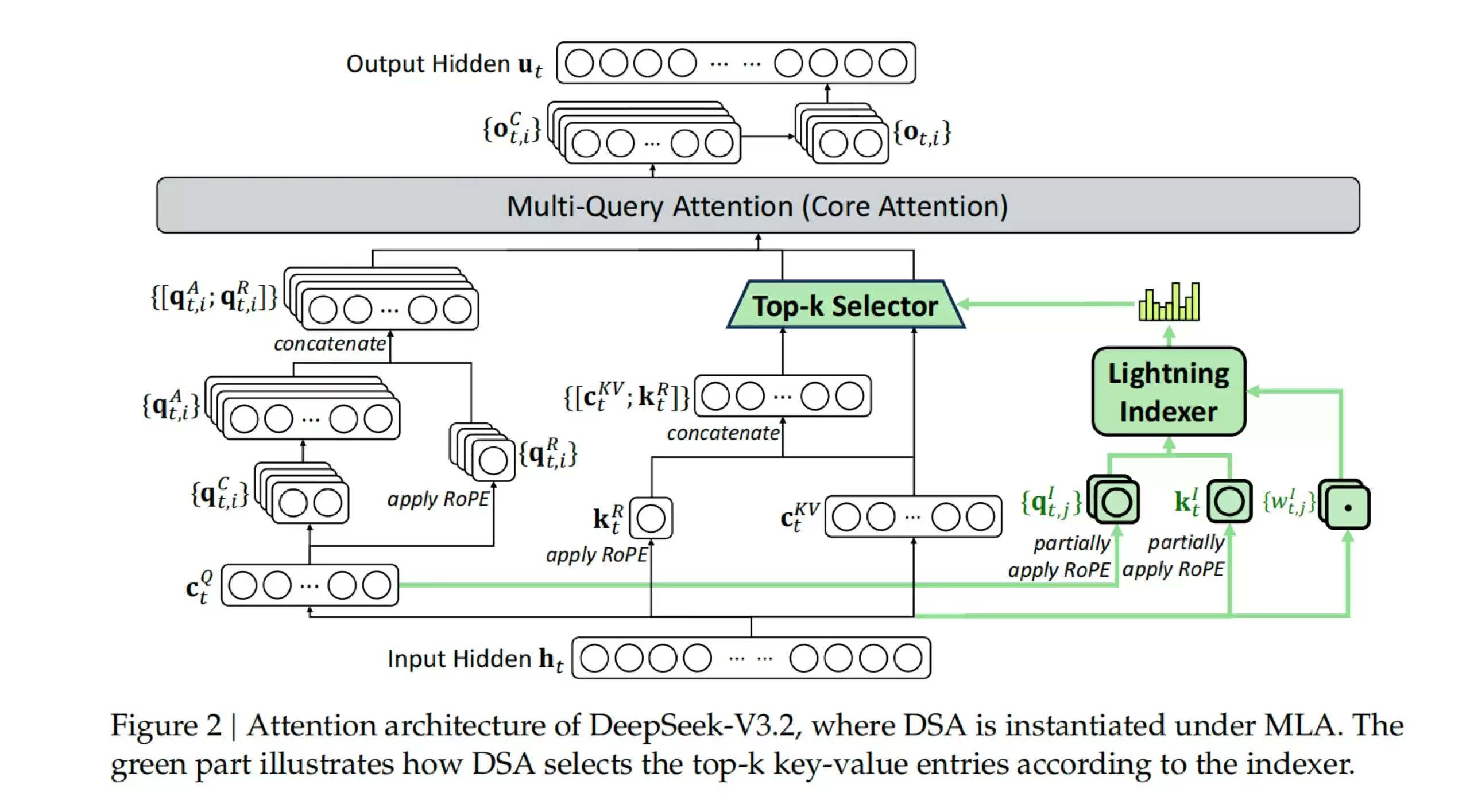 DeepSeek-V3.2 架构上最大的创新在于引入了 DSA(DeepSeek Sparse Attention)机制。这项技术有效降低了计算复杂度,使模型在处理长上下文任务时能够显著加速推理过程,且不会造成明显的性能损失。