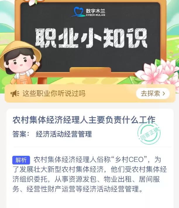 农村集体经济经营管理人员主要负责哪些工作?支付宝蚂蚁新村每日一题的2025年12月1日题目已发布!坚持答题,积累木兰币,即可加速小镇建设。答对本题,立即可享“产速+3/时”的加速奖励!今天的正确答案是【经济活动经营管理】。