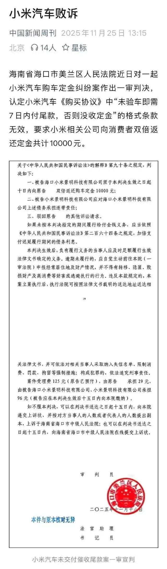 雷军在社交媒体公布成绩后,评论区迅速分化为两大阵营。支持者强调"数据不会说谎",质疑者则翻出旧账:今年5月推出的4.2万元碳纤维机盖选装件,被曝存在宣传与实际不符的问题。车主发现该部件不仅未带来承诺的散热性能提升,反而导致前备箱取消,而小米法务团队"雷军言论不代表技术事实"的回应,更被解读为对品牌创始人的公开背弃。这场风波尚未平息,全国首例定金纠纷案的司法判决又添新伤——法院认定小米单方面修改付款条款的行为违反《消费者权益保护法》,相关格式条款被判无效。