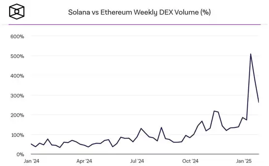 Solana 上 DEX 交易量的激增,可能与美国总统特朗普推出官方 Meme 币有关。这个币上线后迅速走红,一度成为市值排名靠前的加密货币之一。