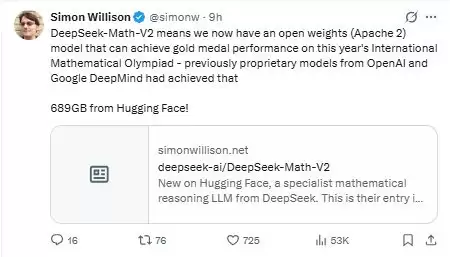 技术博主、英国程序大佬西蒙·威利森(Simon Willison)快速对 DeepSeek Math-V2的发布做了技术层面解读,强调这是一个开放权重模型。他还特意提到,OpenAI和谷歌的同等模型有将近700G,相比之下DeepSeek Math-V2要小得多。