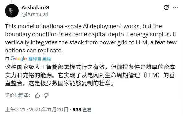 而这则消息瞬间引发热议,正如一位网友评论:这种“国家级人工智能部署”的模式行之有效,但门槛极高:它必须同时拥有“雄厚的资本实力”和“充裕的能源盈余”。 这不仅仅是建一个机房,而是实现了“从电网到大模型(LLM)的垂直整合”,是极少数国家才能复制的壮举。