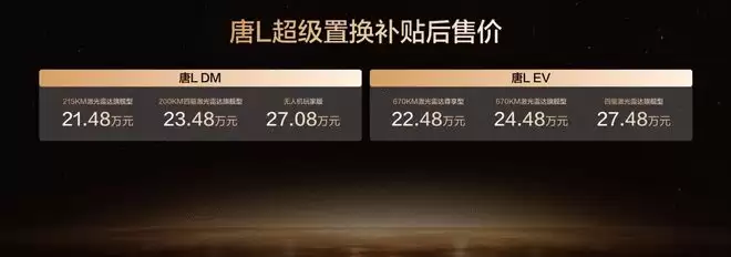 网易汽车11月24日报道2025广州车展,比亚迪正式公布汉L和唐L的超级置换补贴后售价。其中汉L共计6款车型,DM提供3款车型,超级置换补贴后售价19.48-24.48万元;EV提供3款车型,超级置换补贴后售价20.48-26.48万元;唐L DM提供3款车型,超级置换补贴后售价21.48-27.08万元;唐L EV提供3款车型,超级置换补贴后售价22.48-27.48万元。同时,汉L和唐L提供新车色选择,并且推出全新的OTA升级。