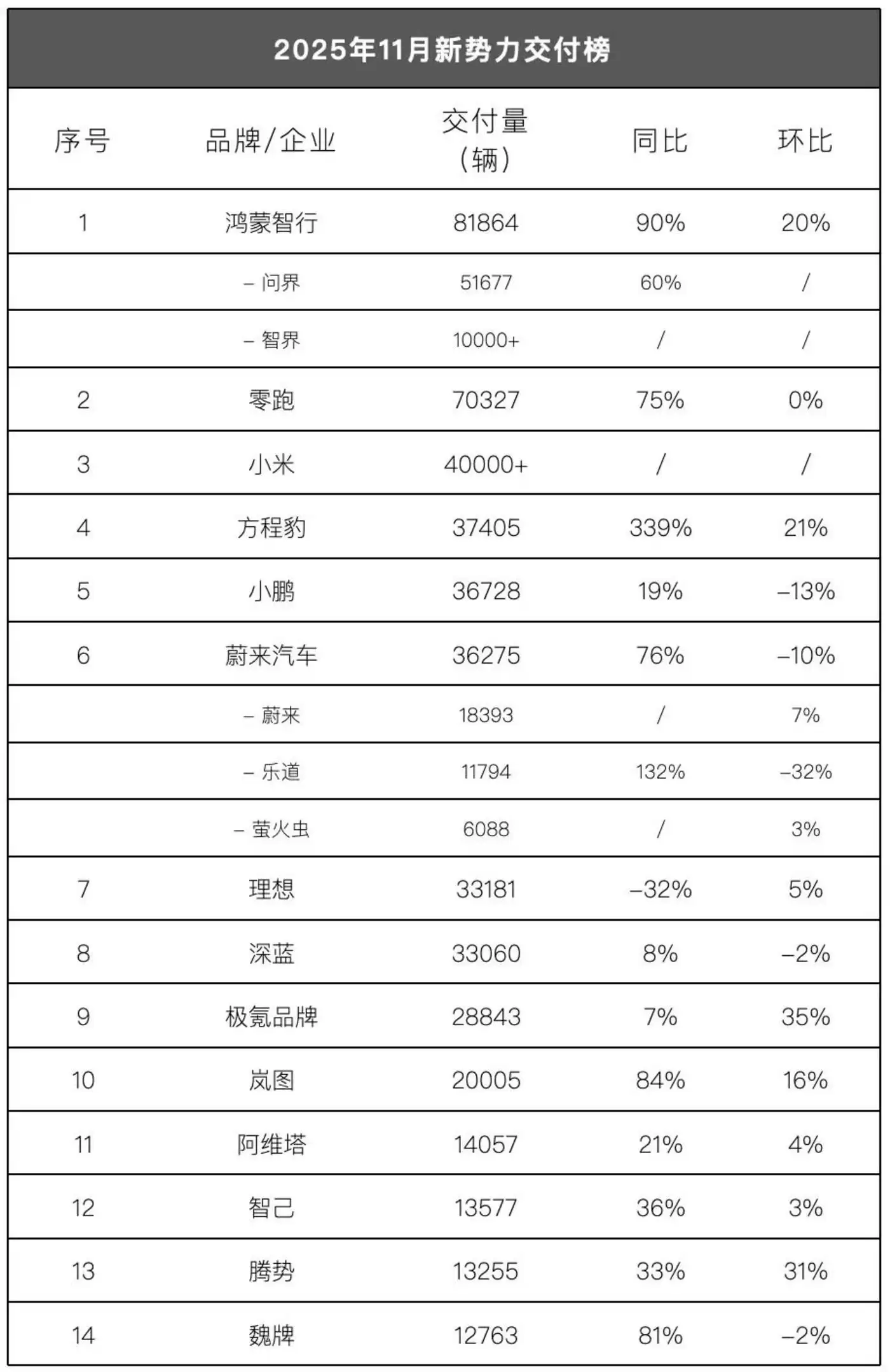 11月,新势力的第一名是“联盟军”鸿蒙智行,全系交付81864辆,同比增长90%,环比增长20%。这背后,是“五界”矩阵开始集体发力:问界依然是绝对主力,智界和尚界贡献了小部分增量,享界和尊界相对稳定。