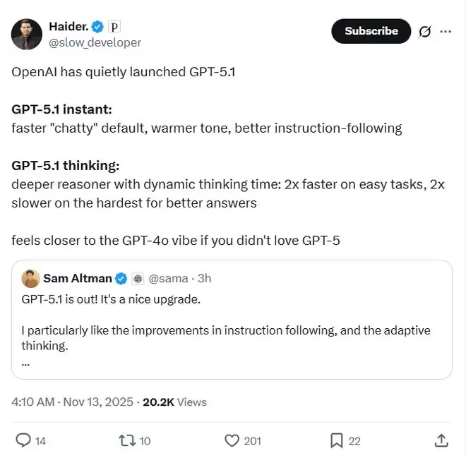 公司CEO萨姆·奥特曼(Sam Altman)也在社交平台X上发帖宣布,“GPT-5.1上线啦!这次升级挺不错的。我特别喜欢它在指令遵循方面的改进,还有自适应思考功能。智能水平和对话风格的提升也挺好。”