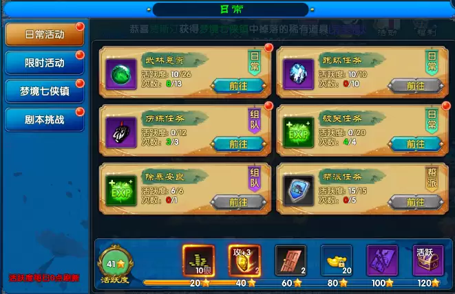 每日的江湖历练是必做内容,任务类型丰富多样,涵盖击败指定敌人、收集特殊物品、护送NPC等。任务难度越高,完成后的奖励越丰厚,建议玩家在能力范围内优先选择高难度任务,以最大化收益。这些奖励不仅包含经验,还可能提供装备材料、游戏币等关键资源,对前期发展至关重要。