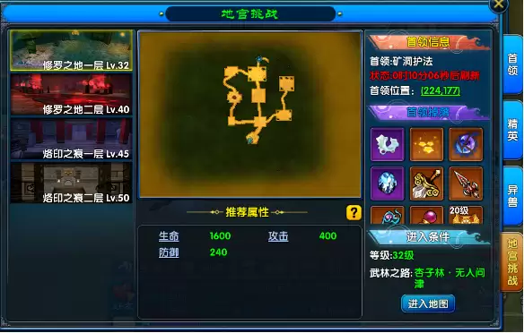 地宫一共分为四层,每层的怪物配置、BOSS强度及奖励机制各有不同,开启条件也逐层提高。第一层“修罗之地”需要玩家等级达到32级,并完成“武林之路·杏子林”剧情任务;第二层开启需等级40级并通关对应武林之路章节;三、四层则分别要求45级和50级,同时满足相应剧情进度。建议大家按照等级梯度逐步挑战,避免因战力不足导致团灭。