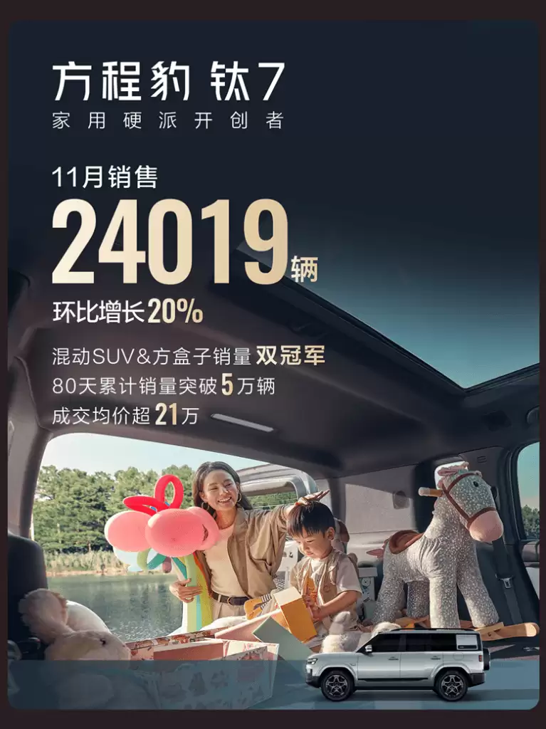 方程豹旗下“5837”四大车型——豹5、豹8、钛3、钛7,各自在细分品类中担当开创者角色,在不同领域表现亮眼。尤其是钛7,11月销量再创新高,成功引爆SUV市场。