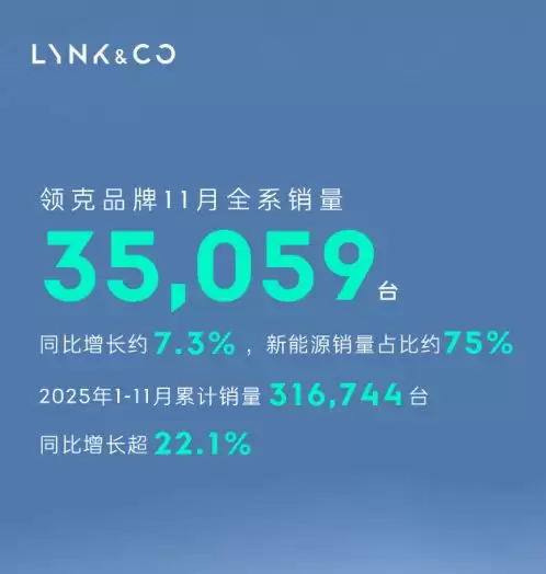 今日,领克汽车公布了2025年11月的销量表现。数据显示,当月领克全系销量达到35,059台,同比增长约7.3%;其中新能源车型销量26,303台,占比高达75%,新能源占比继续保持高位。