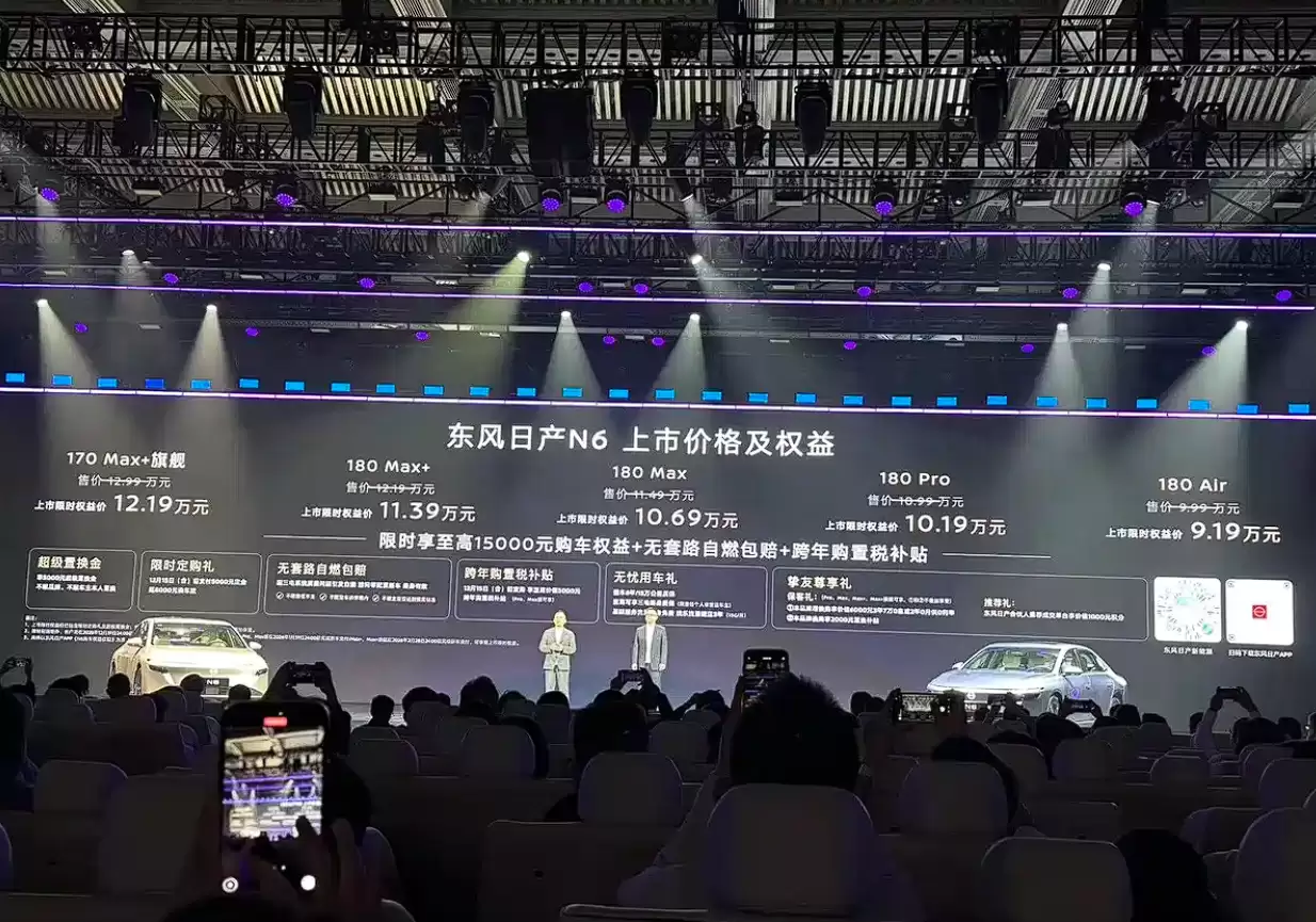 在竞争白热化的10万级插混轿车市场,日产全新车型N6正式上市,共推出5款配置版本,官方指导价区间为9.99-12.99万元,限时优惠后售价为9.19-12.19万元。作为定位略低于N7的插电混动中级轿车,N6将直接对标比亚迪秦L DM-i、银河A7等热门的自主品牌车型,试图在这一细分领域开辟新的市场空间。