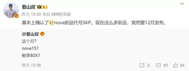 临近年底,智能手机市场再迎重磅传闻,据多方数码博主爆料,华为或将在12月推出其中高端主力nova 15系列,并可能同步亮相畅享系列新成员畅享80X。