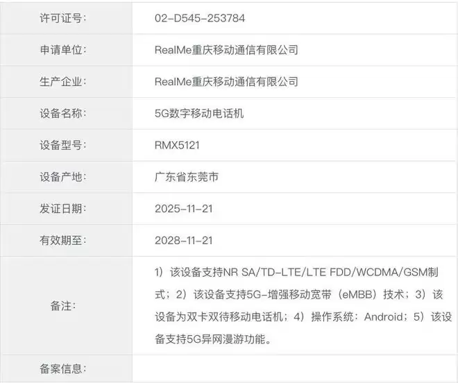 除了定制版新品外,最近的消息还显示,一款型号为RMX5121的真我旗下新机通过了认证。其中没有详细的产品系列信息,但有推测认为其有可能是真我 16 Pro。