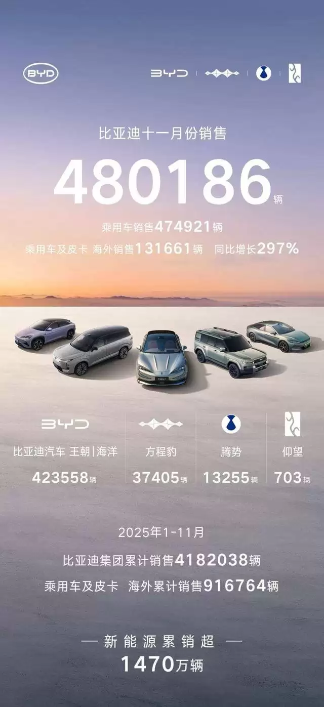 在新能源汽车赛道上,比亚迪正以势不可挡的步伐持续领先。最新数据显示,这家中国车企在11月交出了一份令人瞩目的成绩单——全月销量突破48万辆,达到480186辆;其中乘用车贡献474921辆,再次刷新年内单月销量纪录。这一成绩不仅巩固了其在国内市场的领先地位,更彰显了其在全球新能源领域的强劲竞争力。