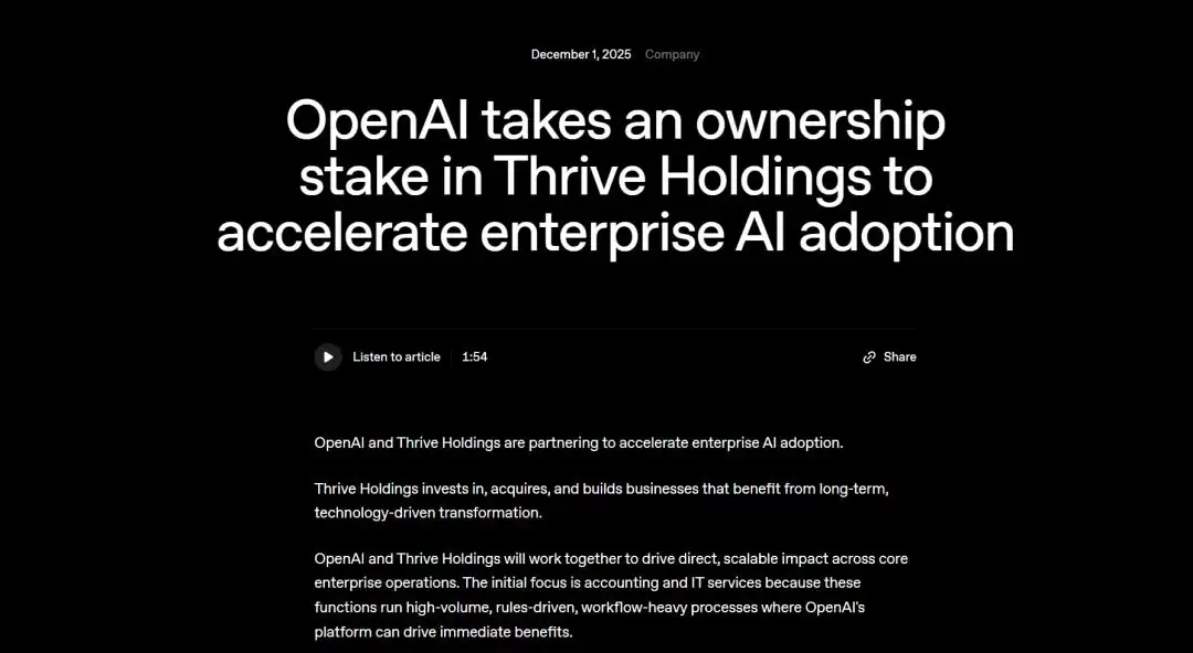 估值达5000亿美元的初创公司周一发布公告称,将持有纽约投资公司兴盛控股集团(Thrive Holdings)的股份,并将在兴盛控股旗下的公司派驻人工智能专家。作为背景,兴盛控股由兴盛资本(Thrive Capital)今年4月设立,后者由约书亚·库什纳(特朗普女婿贾里德·库什纳的弟弟)创办,并从2024年开始一直是OpenAI的主要股东之一。