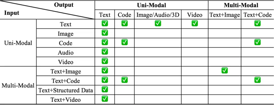 它首次涵盖了所有可能的模态组合作为输入和输出,包括文本、图像、音频、视频、代码、表格、知识图谱、3D对象等。