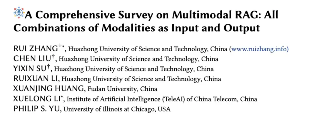 来自华中科技大学、复旦大学、中国电信以及美国伊利诺伊大学芝加哥分校的研究团队联合发布了一篇系统性综述,全面覆盖了几乎所有模态组合作为输入与输出的MM-RAG研究框架,深入勾勒了这一广阔研究与应用领域的技术全景。