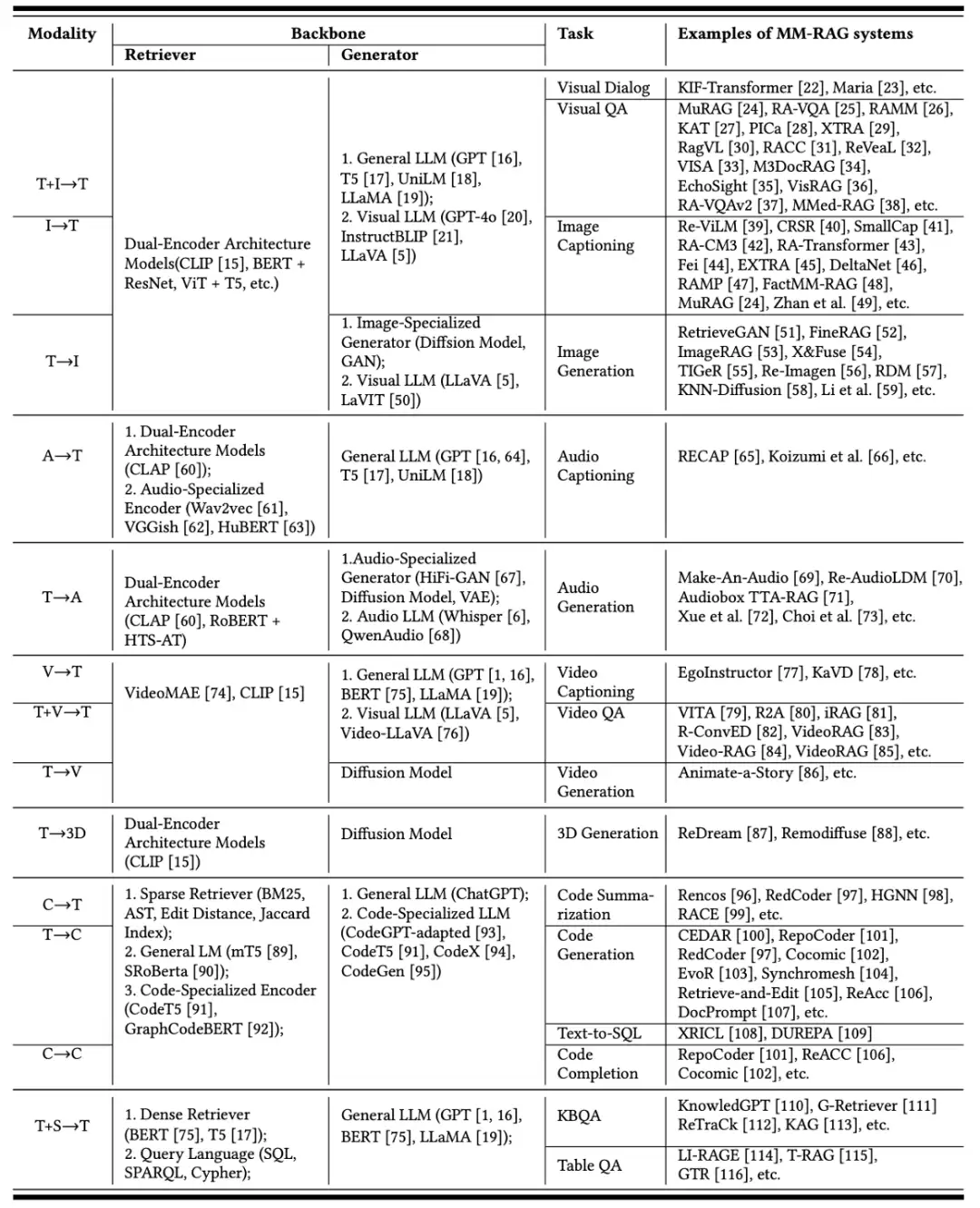 表2:不同输入输出模态下多模态RAG的核心技术组件、任务和应用