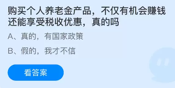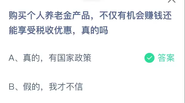 投资个人养老金理财产品,不仅有望获得收益,还能享受到税收优惠政策,这是真的吗?支付宝蚂蚁庄园小课堂开课啦!每天花一分钟参与答题,既能赚取饲料喂养小鸡献爱心,又是件轻松又有意义的事!2025年12月3日蚂蚁庄园小课堂的正确答案是【真的,有国家政策】。购买个人养老金产品确实有机会实现财富增值并享受税收优惠,这是国家政策明确支持的。