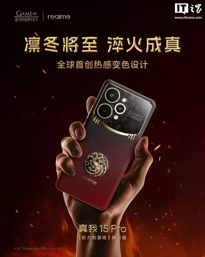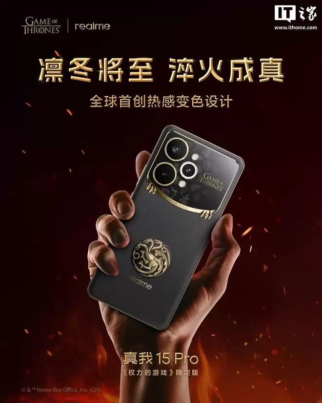 IT之家注意到,realme 真我 15 Pro 手机《权力的游戏》限定版已在海外市场发布。作为参考,普通版的真我 15 Pro 搭载骁龙 7 Gen4 处理器,搭配大面积散热腔与 7000mAh 电池,并配备 144Hz OLED 屏幕,这款联名版机型的机身厚度增加到 7.84mm(标准版为 7.7mm)。