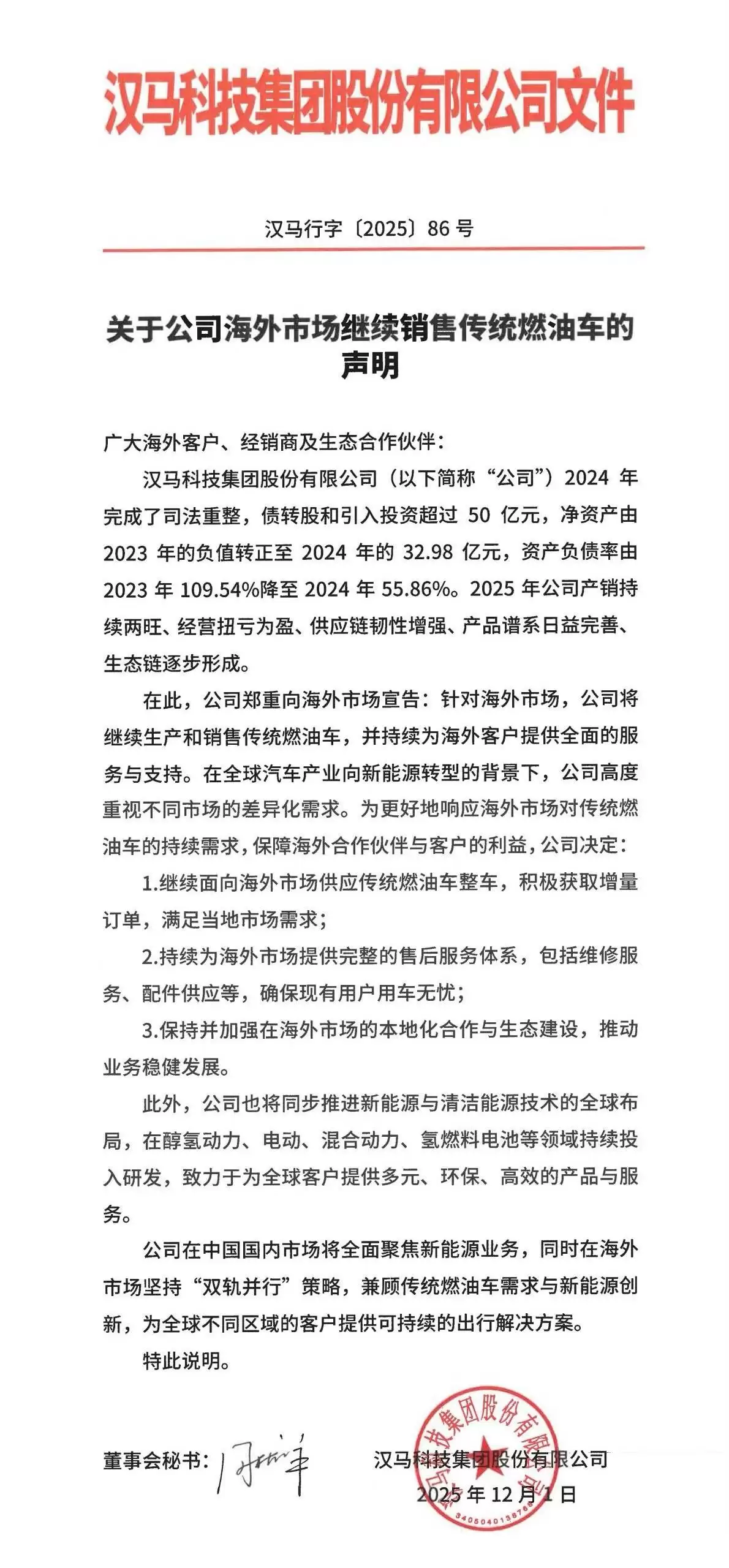 公开信息显示,汉马科技此前已明确新能源转型方向。2024年6月,公司曾发布公告,计划于2025年12月停止传统燃油车的整车生产,全面转向纯电动、甲醇动力、混合动力及氢燃料电池等新能源与清洁能源汽车业务。这一战略调整体现了公司对绿色出行的坚定承诺。