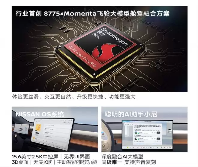 在智能化上,N6新车搭载全新自研的云享座舱,软件配备N7同源的NISSAN OS超级车机系统,硬件采用高通骁龙8775车规级芯片与15.6英寸超清2.5K大屏,带来平板式丝滑交互。融合科大讯飞星火大模型和DeepSeek-R1深度推理大模型,具备前后排四音区精准拾音能力,还支持连续指令识别、川粤方言交互,支持无麦K歌、声音复刻、智慧场景等。车机系统兼容华为HiCar、苹果CarPlay等互联方式。