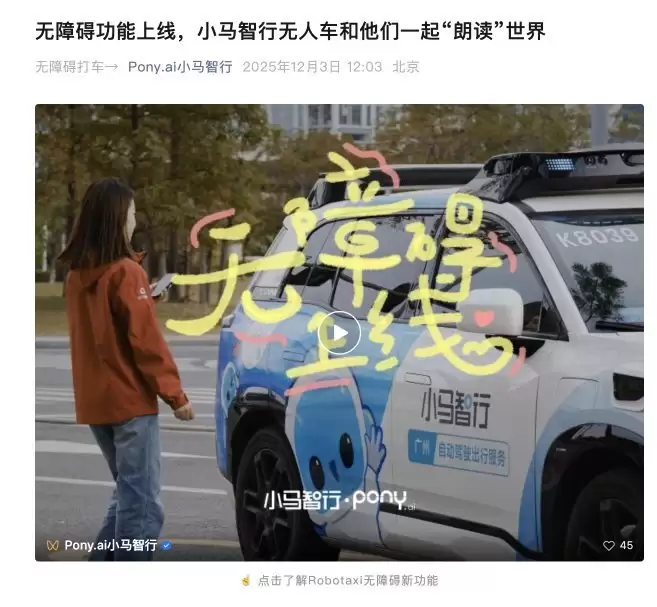 12月3日,小马智行无障碍功能正式上线,未来将逐步推广至所有自动驾驶车型。