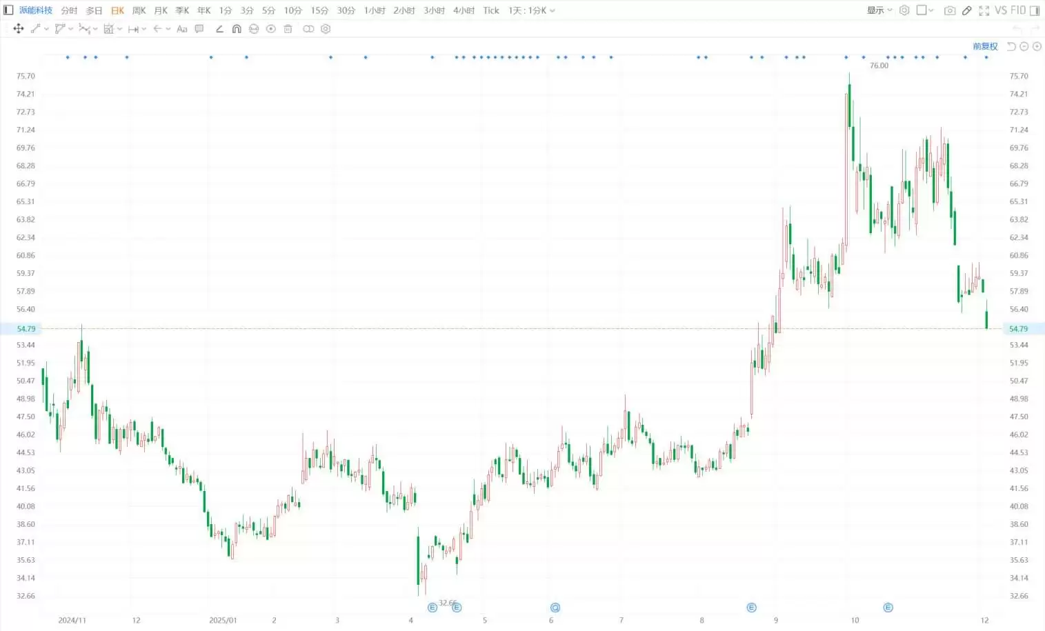 派能科技股票今日遭遇较大跌幅,单日下挫5.36%,收盘价报54.7元。这一价格创下自9月4日以来的股价新低,也是近三个月来的最低水平。