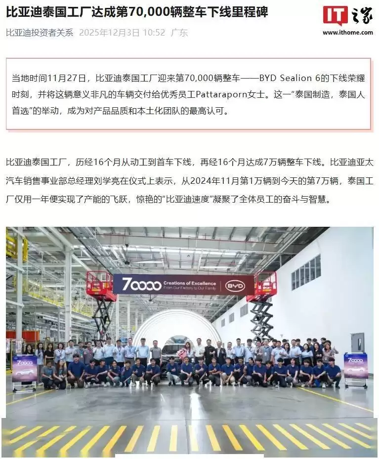 比亚迪榜首泰国工厂投产:16个月7万辆整车下线 全球化战略提速