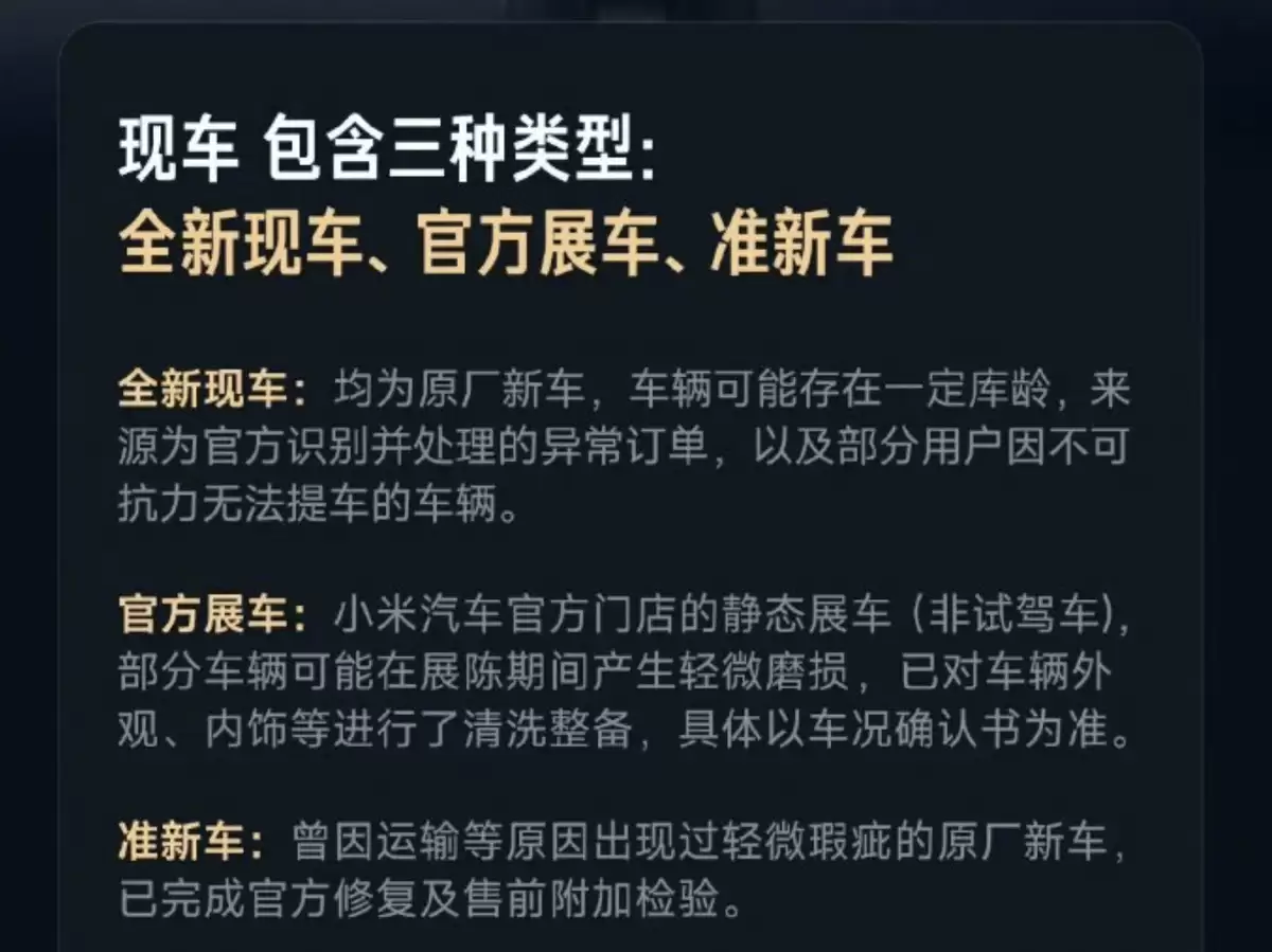 此次推出的"现车"涵盖多种类型,包括全新现车(多为库存车)、最新展车(仅作静态展示,并非试驾用途)以及准新车(因运输等环节导致车辆出现瑕疵,且有维修记录)。目前,该服务优先面向订单用户,从3号起将全面向所有消费者开放。