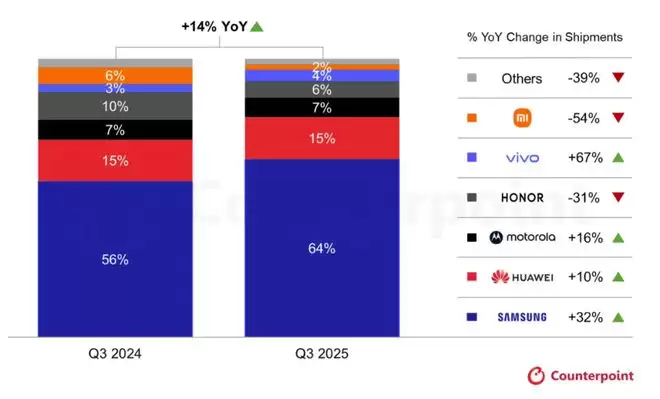 然而,市场整体的增长掩盖不住品牌之间的激烈分化,报告显示三星凭借Galaxy Z Fold7等新品,出货量同比大幅增长32%,稳居全球第一。