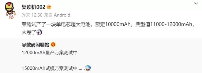 数码圈再次被一则重磅消息点燃,原因是有博主爆料荣耀正在试产一块额定容量达10000mAh、典型值可达11000-12000mAh的单电芯超大电池。